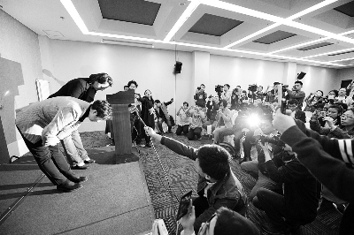 昨天(4月6日),和颐酒店的相关负责人在发布会上鞠躬道歉 摄/记者 林晖