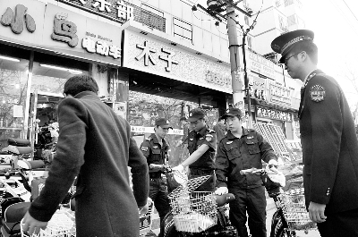 千龙-法晚联合报道 明明店里有地方,却非要将电动自行车摆放在人行横道上,见到城管就说要改正,城管一走依然如故,行人只好在机动车道上行走。法制晚报记者9日上午从丰台城管局获悉,丰台城管局马家堡执法队在角门北路,对存在店外经营行为的多家电动车店开展专项执法,依法暂扣大小电动车64辆。