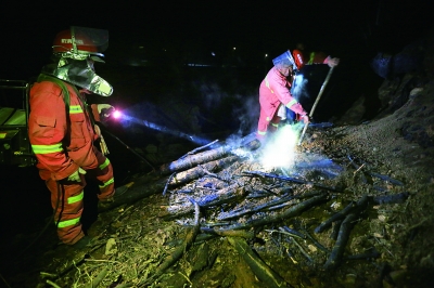 昨晚9时许,记者看到石马峪村多处都有村民志愿者和消防人员值守,他们仍在排查可能复燃的地点。一名村民家南侧堆着几根烧断的木头,仍在冒着烟,两名消防员正将背包中盛满的水倾倒在木头上,随后将几根木头拆分开来,看到内部还冒着呛人的烟雾。