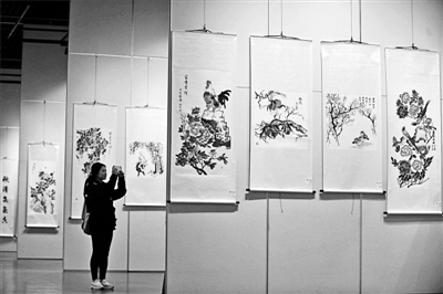书画展现场,在当代画坛有着“黄胄的驴,晋庸的鱼”之说的著名画家冯晋庸的作品《鱼》,山水画家、中国名家书画院副院长史贵仁的巨幅画作《桃花深处》,山水名家刘万青的巨幅画作《平谷山水》,中科院博士生导师辛希孟的巨幅书法行楷《桃花源记》等精美作品,引得参观者纷纷驻足。其中,中科院美协主席、平谷本地画家周春民为此次书画展创作的巨幅画作《紫气东来》、《盛世吉祥》最为震撼,更是吸引了诸多书画爱好者拍照品鉴。