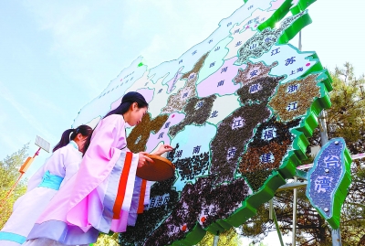 4月20日,在八大处公园,身穿汉服的茶艺师们正在“绘制”中国“茶”地图。为了便于市民认清茶叶、了解各地代表的特色茶,茶艺师们用半个月制作了中国“茶”地图,展示了我国18个省市自治区所产的红、绿、青(乌龙)、黄、黑、白六大类品种茶。
