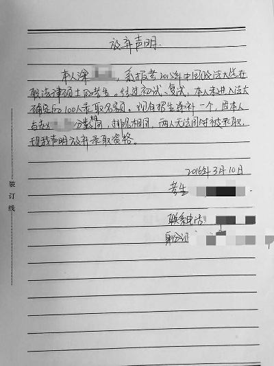 赵先生联系到那名女生的丈夫,对方得知此事后也很纳闷,双方商量联系法大看看能不能再增加一个名额,把两人都录取了。但法大研究生院的答复是只能录取一人。赵先生称,与他同分的女生放弃了录取机会,被补录到了其他学校,她还向赵先生出具了一份书面说明。