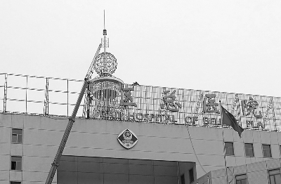 昨日下午,记者在北京军区总医院门诊楼前看到,工人们正在拆除原有的“北京军区总医院”牌子。在停车场内一辆塔吊竖起了吊臂,楼顶上有3名工人,他们将牌子逐一拆下,并捆在吊臂上运送到地面。