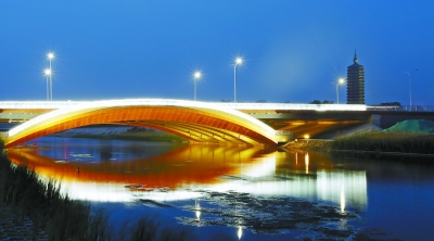 昨晚(4月28日),通州北关大道跨通惠河桥——“青叶伏波”主体结构竣工并进行了夜景照明试灯。该座大桥是全市首座单拱跨河景观全钢大桥,位于规划北关大道跨通惠河处,桥梁为三跨上承式拱桥,全长163.78米,桥梁主孔范围内人行道外侧增设2至3米宽景观步道,总面积约4200平方米,是通州核心区内重要的市政基础设施,同时也是核心区重要的景观节点。桥梁充分考虑其与周边燃灯佛舍利塔、运河水乡区、程家大院、西海子公园、通惠河景观的空间形态关系,选择采用拱桥形式。以“柳叶”作为设计理念,展现水乡区的“柳叶随波”“龙舟撑出柳荫来”的意境。