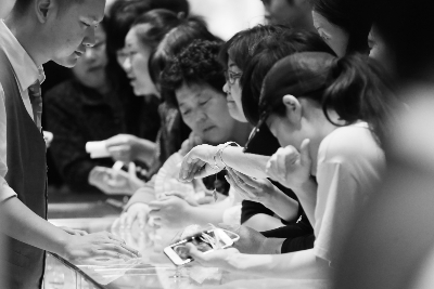 黄金柜台处围满了来消费的市民。摄/记者 曹博远