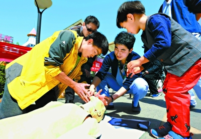 昨天(5月6日),健康联盟“吾动健康”服务走进社区。地区健康联盟成员单位安贞医院、中国健康教育中心、联合大学师范学院、 安贞社区卫生服务中心、广济中医院、红枫盈养老照料中心等单位,为社区居民开展健康知识宣传、心肺复苏急救演示、咨询义诊等活动。(记者程功 摄)