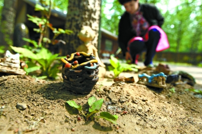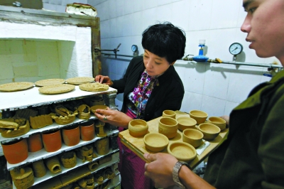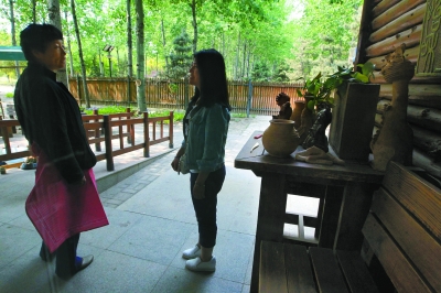 朝阳区古塔公园一栋林木掩映下的木屋里,姚怡和一位年轻人在忙着将各种造型的陶艺作品装窑。