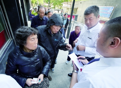 今早,不少大爷大妈穿着冬衣提前来排队。银行工作人员给他们发号