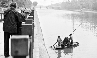 工作人员正在对清河的水草进行清理 摄/记者 郭谦