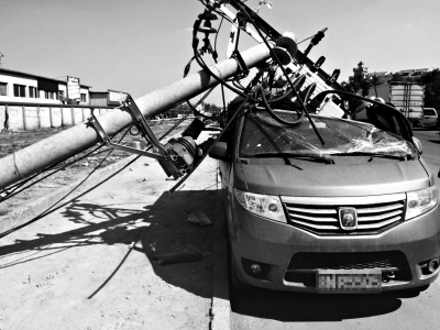 昨天记者来到事发路段,看到太平庄北街燕丹汽配城附近路段仍然无法通车,事故现场满地狼藉。现场抢修人员正忙着收拾满地的线缆,四根倒下的电线杆仍压在路边的车上,每一根线杆都至少砸中了一辆车,其中一辆被砸中的面包车当场起火,已经烧得看不出原来的模样。
