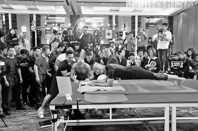第二届平板支撑世界杯比赛近日在京举办。现平板支撑吉尼斯世界纪录保持者北京市公安局特警总队队员毛卫东和原世界纪录创造者美国海军陆战队退伍老兵乔治·胡德以及10名国内外平板支撑高手参加了此次比赛。