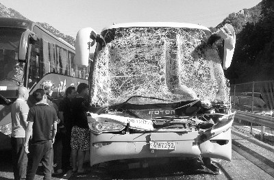 公交车在发生车祸后,前风挡玻璃碎成网纹状 摄/张金华