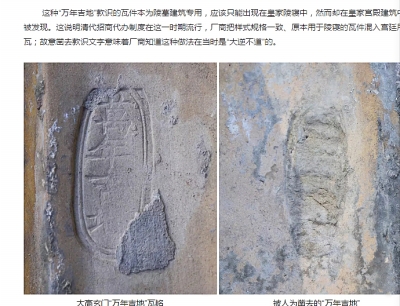 更出乎意料的是,工作人员居然找到了一些带有“万年吉地”款识的瓦件。专家分析,是厂商把样式规格一致、原本用于陵寝的瓦件混入了宫廷用瓦。 鉴于瓦件上的字迹有凿毁痕迹,专家认为更大可能是故意为之。