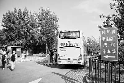 5月17日下午,一辆旅游大巴驶入颐和园新建宫门外新设的旅游大巴停车场。 本报记者 邓伟摄