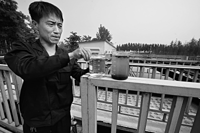 在潞城镇污水处理厂,工作人员展示处理前后的水质区别。本报记者 方非摄