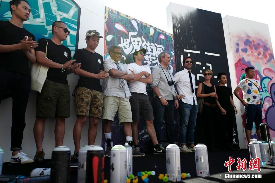 7月1日,《世界街画艺术展》在位于北京的中央美术学院举行,通常被认为是“涂鸦”的街画艺术首次在此展出。50多位中外街画艺术家的作品参展,展览将持续至8月24日。图为部分参展中外街画艺术家在开幕式上登台亮相。 中新社记者 侯宇 摄