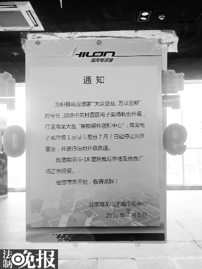 在二层东侧一面玻璃上,一则海龙电子市场中心贴出的《通知》似乎印证了他的说法。上面文字表明,为加快中关村西区电子卖场转型升级,打造海龙大厦“智能硬件创新中心”,7月7日起停止营业,进行升级改造。