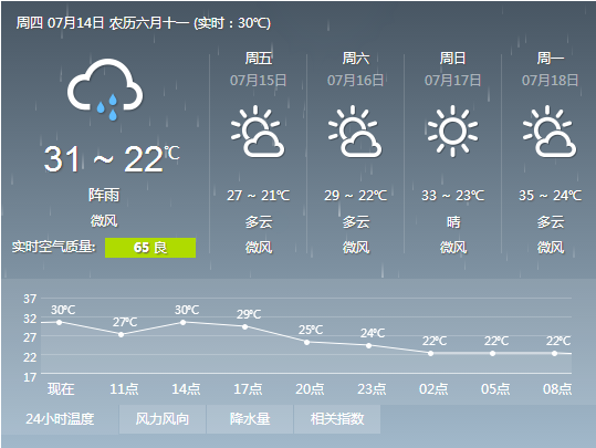 市气象台6时发布:今天白天多云转阴,午后有阵雨,伴有弱雷电,北转南风2、3级,最高气温31℃;夜间阴有阵雨,伴有弱雷电转多云,南转北风1、2级,最低气温22℃。今天一股冷空气将抵达京城,天空云量增多,午后至夜间将迎来一次阵雨天气过程,伴有弱雷电。届时气温也有所回落,预计今天的最高气温为31℃。