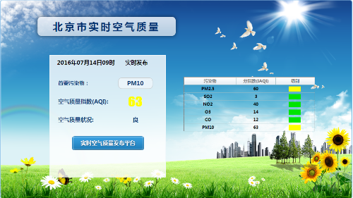 据北京空气质量实时监测,上午9时空气质量指数:63,属于良。温馨提示:可以正常在户外活动,易敏感人群应减少外出。