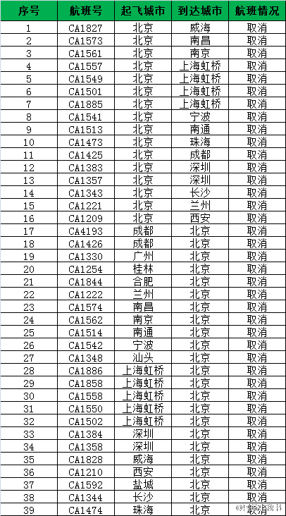 部分取消航班信息