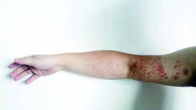 昨天下午,记者在廊坊市香河县的一个房屋内见到了刘先生,他称自己就是那辆保时捷的车主。他的右手臂、左手背和腹部密布一两百个红点,全是遭到袭击后留下的伤痕。