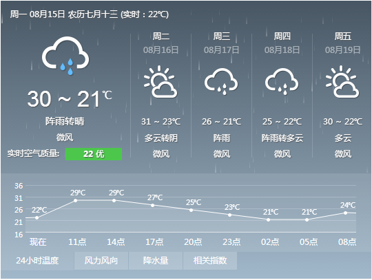 今天上班时阴天间多云有阵雨,南风二三级,气温23~26℃;下班时多云,南风二三级,气温30~27℃。