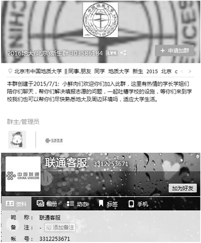 记者找到被举报推销电话卡的“2016地大(北京)新生群”,看到一名管理员的头像显示为“中国联通”,群名片为“联通客服”。但记者申请加入该群时,需要输入所录取专业和姓名等验证信息。
