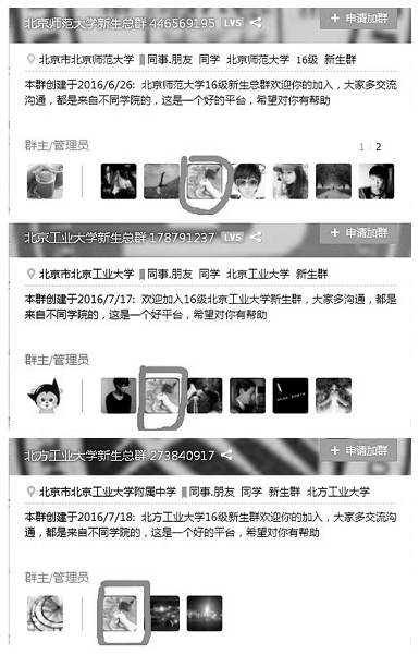 此外,几个“新生总群”之间经常“共用”一个群主。如“中国农业大学新生总群”的群主“何方”,其QQ号为772××××63。而在“北京师范大学新生总群”、“北京工业大学新生总群”和“北方工业大学新生总群”中,也看到了一模一样的群主头像,对应相同的QQ号。
