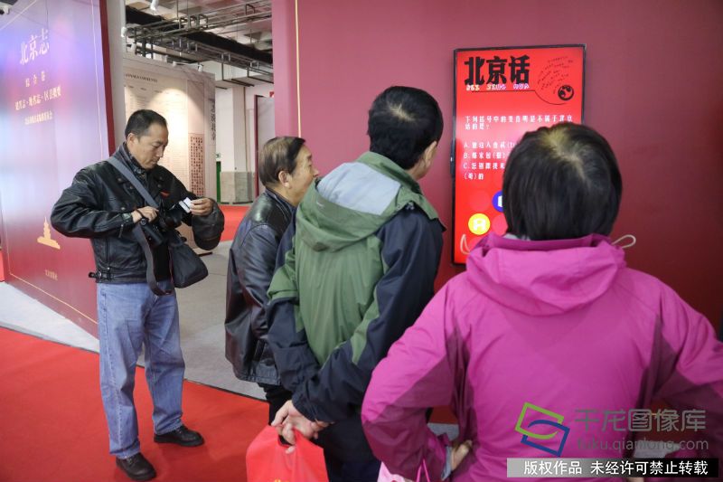 走出蜿蜒的书丛,往右一瞥,就是整个展区人气儿最高的地方。是不是正宗的老北京,来这儿一测便知。“芥末墩儿”、“老不咔嚓眼”……一组组熟悉的老北京土话从一个橙红色电话亭里的电话听筒中传出来。有意思的是,爱玩儿这款高科技的居然都是老年人,而且还是组团挑战,一人上前,几个人在后面支招儿,还真热闹!