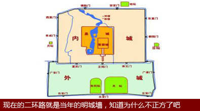 修完这段外城,朝廷发现没钱修不起外城的剩余部分了,于是在修好的那一段外城的东西墙的北端,又各修了一段东西向的城墙跟内城连上。于是北京城就变成“凸”字形的了。