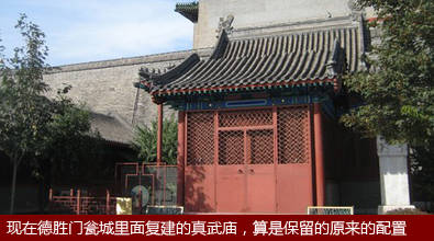 北京内城九门都有瓮城(瓮城的用途是战时加强对城门的防守),每座瓮城里边儿都有庙。其中七座是关帝庙,两座是真武庙。关帝关二爷就不用说了,真武庙里供的是真武大帝,因为真武大帝是北方之神,所以北边德胜门安定门两座城门得靠他老人家把门儿。