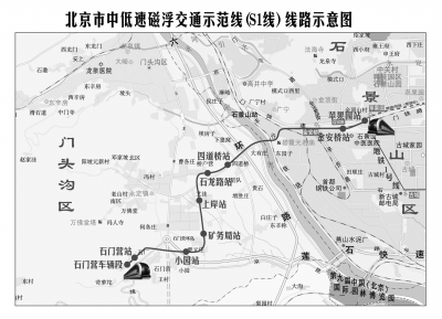 12月25日,北京市重大项目办宣布,首列北京S1线磁浮列车已进京到达S1线石门营车辆段,将启动列车调试,预计会在2017年实现载客运行。S1线是北京首条磁浮线,也是北京中低速磁悬浮交通运营示范线。规划呈“反Z”状,西起门头沟石门营站,东至石景山区苹果园站,自西向东分设石门营、小园、矿务局、上岸村、石龙路、四道桥、金安桥和苹果园8座车站。未来开通之后,在金安桥站,将可与地铁6号线西延段换乘,在苹果园站,可与地铁1号线以及6号线西延段实现换乘。