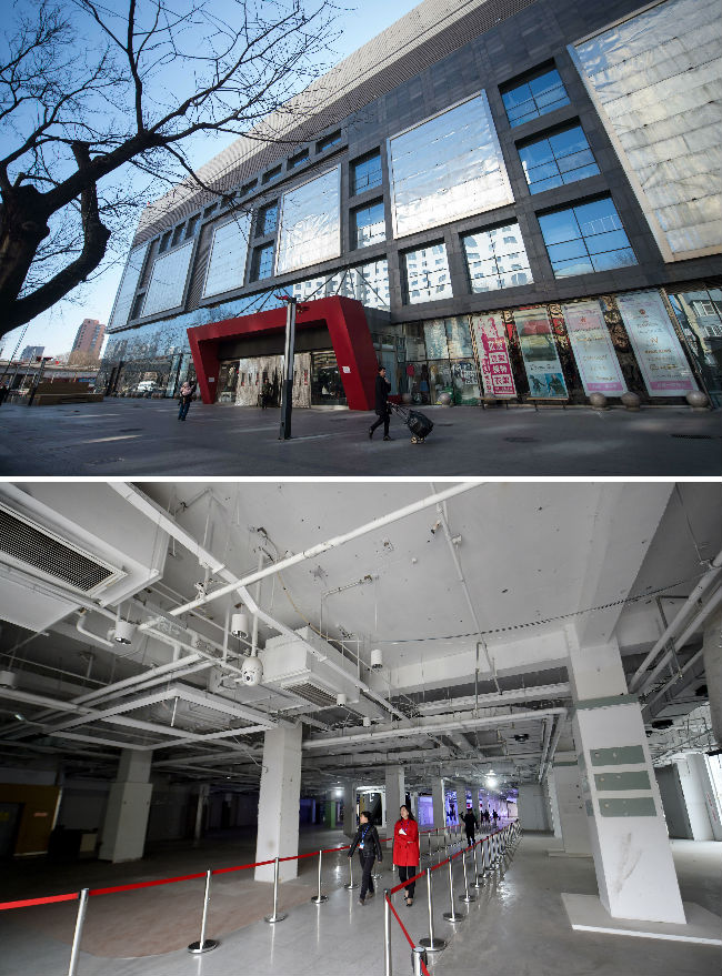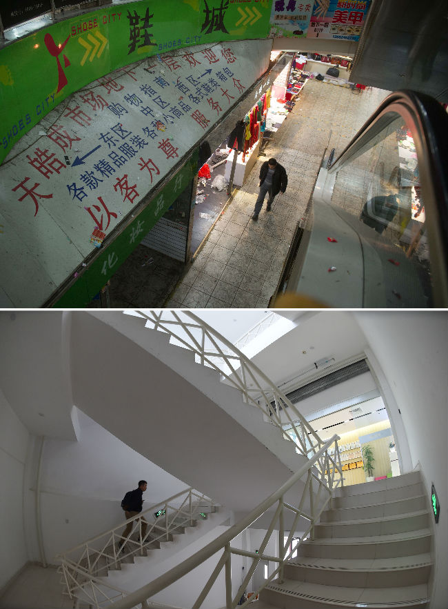 ↑拼版照片的上图:一名男子行走在空荡的天皓成服装批发市场地下一层(2015年1月12日摄);下图是已转型为宝蓝金融创新中心的第一个完成疏解的天皓成服装批发市场(4月3日摄)