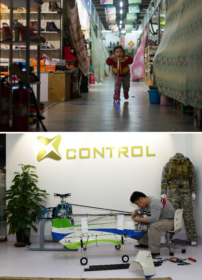 ↑拼版照片的上图:一名小朋友在空荡的天皓成服装批发市场玩耍(2015年1月12日摄);下图为一家无人机开发企业的工作人员在由天皓成服装批发市场转型的宝蓝金融创新中心工作(4月3日摄)。