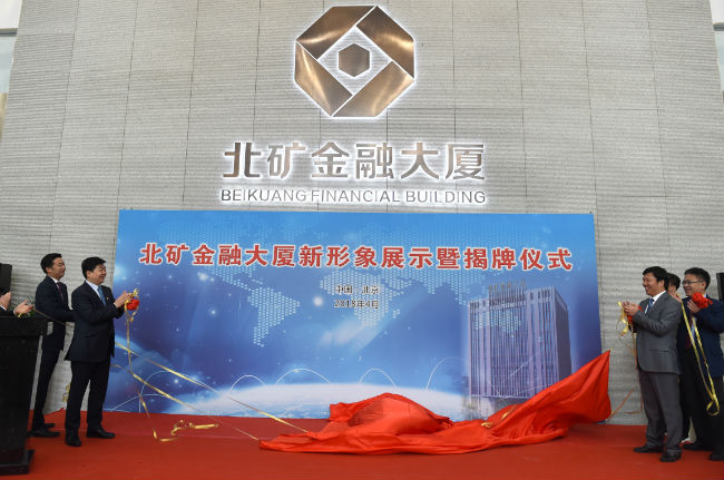 ↑由原本做服装批发市场的天和白马二期转型的北矿金融大厦举行揭牌仪式(4月3日摄)