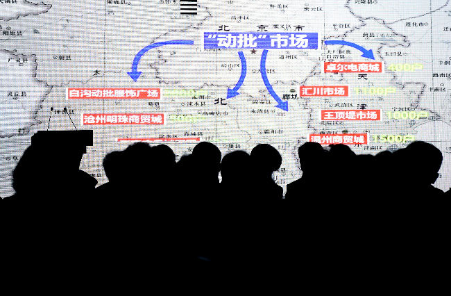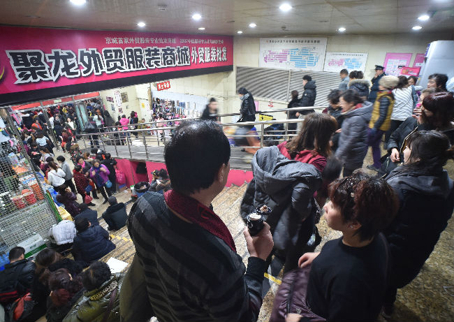 ↑市民在即将疏解闭市的聚龙外贸服装商城选购商品(2015年12月29日摄)