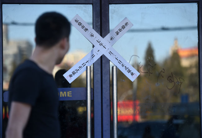 ↑一名行人从已经贴上封条的东鼎服装批发市场门外走过(2017年11月30日摄)
