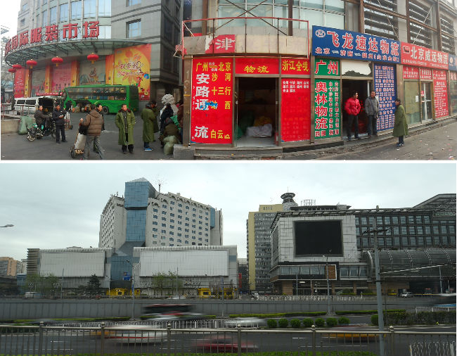 ↑拼版照片的上图:疏解前的动物园批发市场外景(2013年12月25日摄);下图为已经疏解完毕的动物园批发市场外景(4月3日摄)