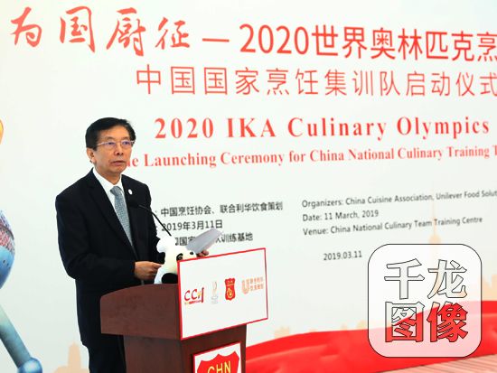 3月11日,为国厨征——2020世界奥林匹克烹饪大赛中国国家烹饪集训队启动仪式在联合利华研发中心举行。图为中国烹协会长姜俊贤致辞。中国烹协供图 千龙网发
