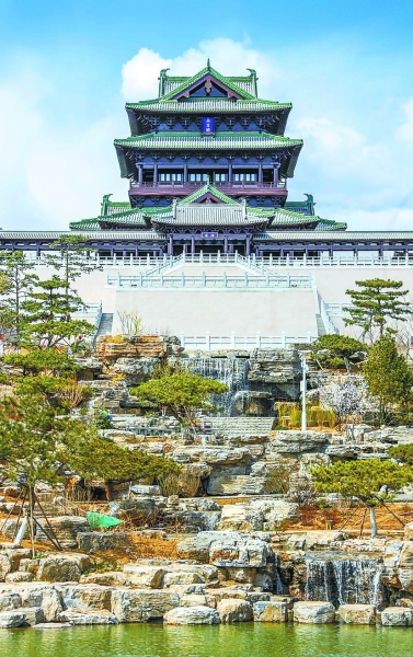 在园区中央的天田山顶上,耸立着一座辽金风格的传统建筑——永宁阁。它北临妫河,远眺燕山,俯瞰妫汭湖,是整个园区的制高点。