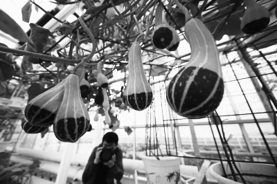 在室内展区内,工作人员向记者展示了一盆据称是黄瓜的绿色植物。“哪里有黄瓜?”看着眼前的植物,记者难以将其和生活中的黄瓜联系到一起。在得到工作人员的提示后,记者才看到了密密麻麻的小黄瓜。只有米粒大小的黄瓜,顶着比自己身体还大的小黄花,密集地生长在细细的藤蔓上。在展区的另一边,一种颜色鲜艳、形似芒果的果实也吸引了不少游人的眼球。它看起来像是水果,其实也是蔬菜。“百蔬园内没有水果,这是一种观赏茄子”,工作人员的介绍让很多游客大呼意外。