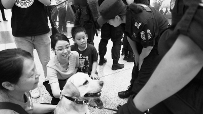 比利时进口的寻血猎犬擅长寻味搜人,霸气的东德负责扑咬,温顺可爱的拉布拉多和史宾格执行搜爆任务,它们都是现场的“小明星”,和小朋友们进行了亲切互动。一位老人兴致勃勃地抱着直立后腿站起来的拉布拉多合影自拍。拉布拉多犬“奇迹”还和史宾格猎犬“八月”与游客进行拔河比赛,引起一阵欢笑。