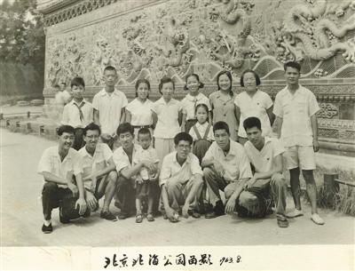 看着老照片,宋棣格外兴奋,一个个念出学生们的名字。大家回忆起照片里的往事——上个世纪50年代,他们是东城南锣鼓巷内前圆恩寺小学上学(现并于黑芝麻小学)的同班同学。1963年夏天,正值他们高中或中专毕业,班长分配到湖南株洲电力机车厂工作,10个同学在北海公园聚会送他离京,宋棣也带4个儿女前来送行。“我们登上白塔眺望北京,坐上大摆渡游太液池,在五龙亭回忆往事,最后到九龙壁前拍下了这张合影留念。”王玲回忆道。