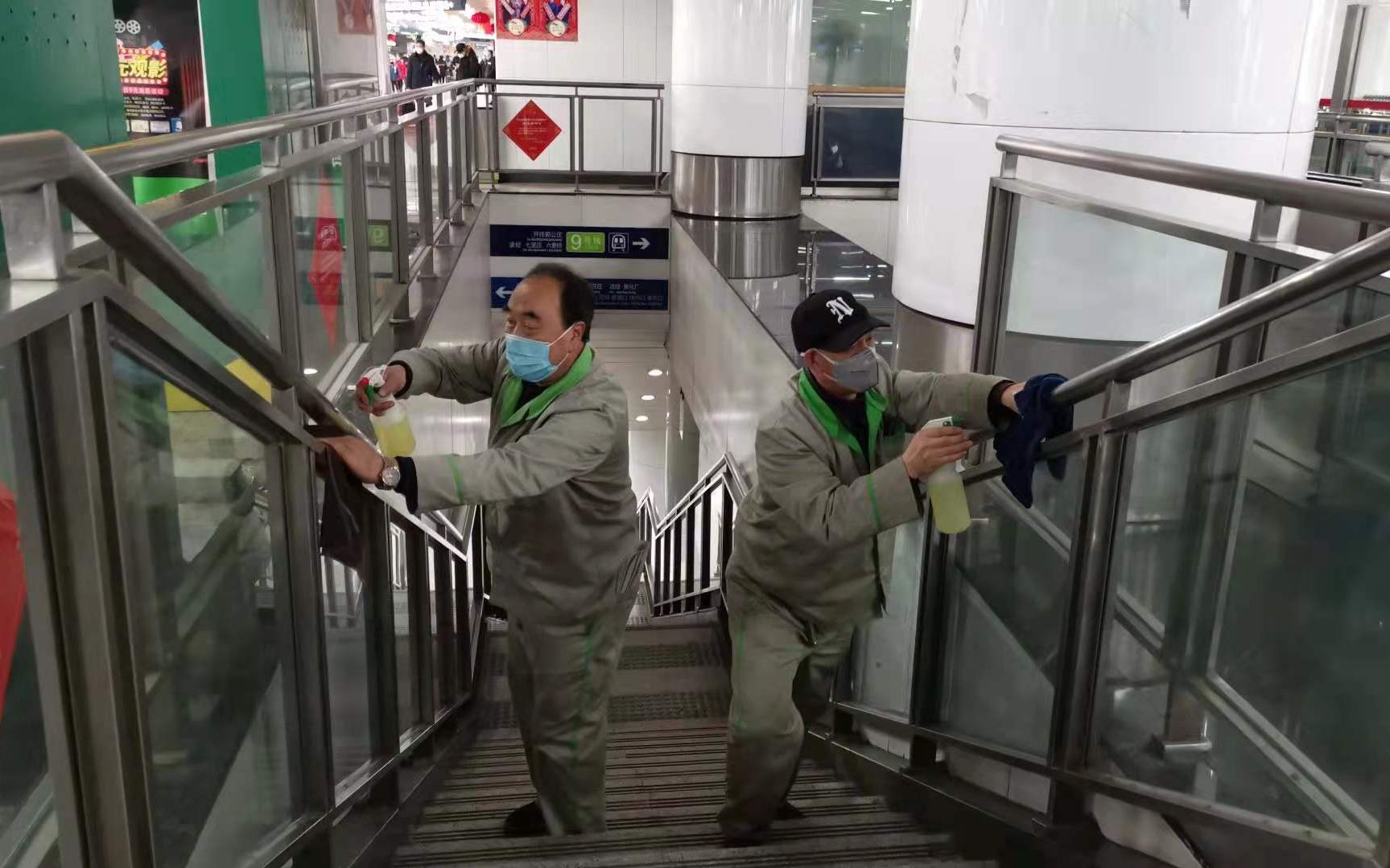 工作人员在地铁北京西站内进行消毒保洁工作。摄影/新京报记者 李凯祥