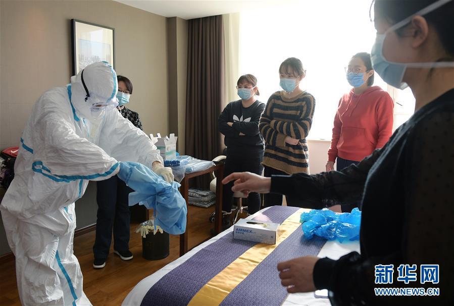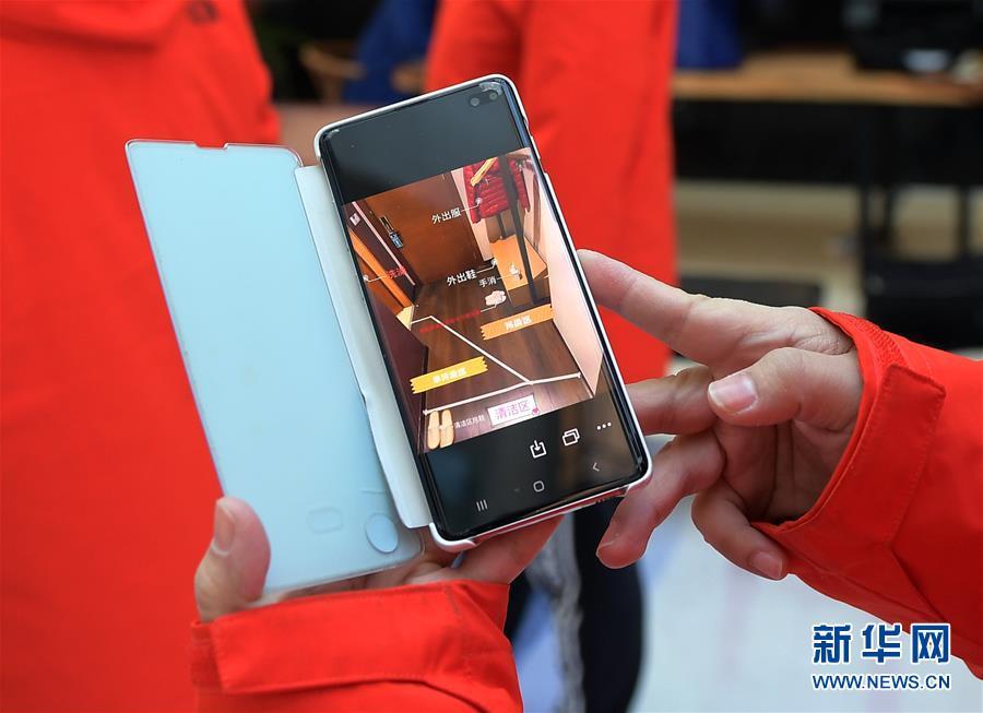 1月29日,一名来自北京宣武医院的医护人员用手机向队友展示如何将驻地休息房间规划分区,以防止交叉感染。 当日,北京市属医院驰援武汉医疗队队员在驻地利用休整时间加紧练习防护技能,为进入“前线”救治病患做最后的准备。据了解,这支医疗队由北京友谊医院、北京安贞医院、北京宣武医院等12家北京市属医院的136名医护工作者组成,他们大多来自重症医学、呼吸、感染等专业。 新华社记者李贺摄