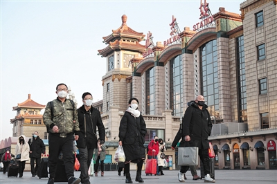 新京报讯 昨日是正月农历初六,受到新型肺炎疫情影响,今年春节假期延长到2月2日。铁路部门数据显示,近几日,不少旅客推迟返京计划,客流量下降将近7成。据北京铁路局介绍,昨日,北京地区到达旅客18.4万人。目前,北京所有火车站乘客出站时都需要测量体温,只有体温不超过37.3摄氏度才能通行。