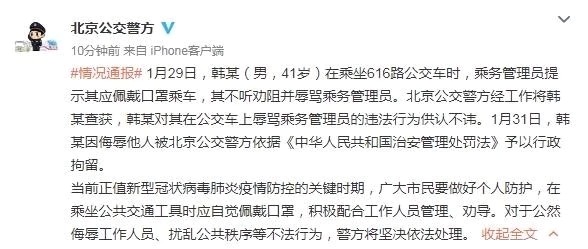 1月31日,韩某因侮辱他人被北京公交警方依据《中华人民共和国治安管理处罚法》予以行政拘留。警方提示,当前正值新型冠状病毒肺炎疫情防控的关键时期,广大市民要做好个人防护,在乘坐公共交通工具时应自觉佩戴口罩,积极配合工作人员管理、劝导。对于公然侮辱工作人员、扰乱公共秩序等不法行为,警方将坚决依法处理。