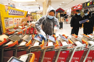 2月13日,西城区天虹商场,商场超市工作人员为购物推车消毒。新京报记者 侯少卿 摄