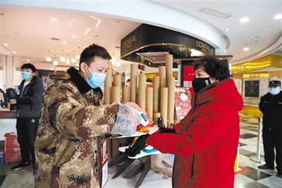 2月13日,西城区天虹商场,工作人员在为进入商场的市民测量体温。新京报记者 侯少卿 摄