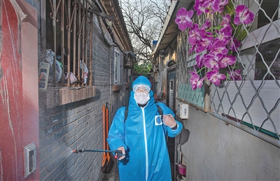 2月10日下午两点,东城区驹章胡同,街道平房区物业管理员卢链背着近40斤重的消毒液对社区公共场所消毒。